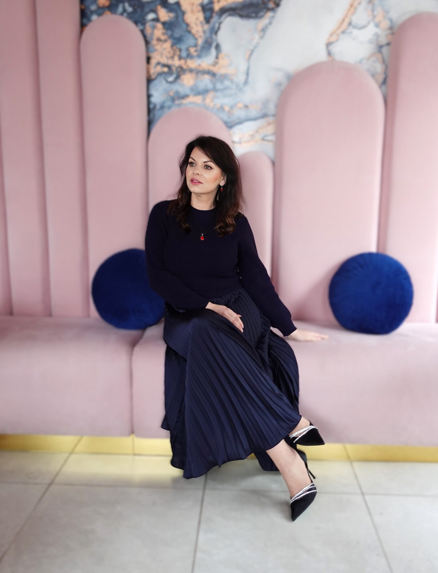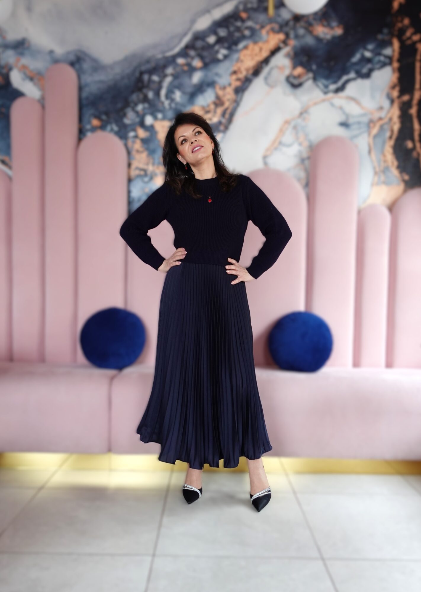 Dodaj odrobinę klasy do swojej garderoby dzięki plisowanej granatowej eleganckiej sukience!